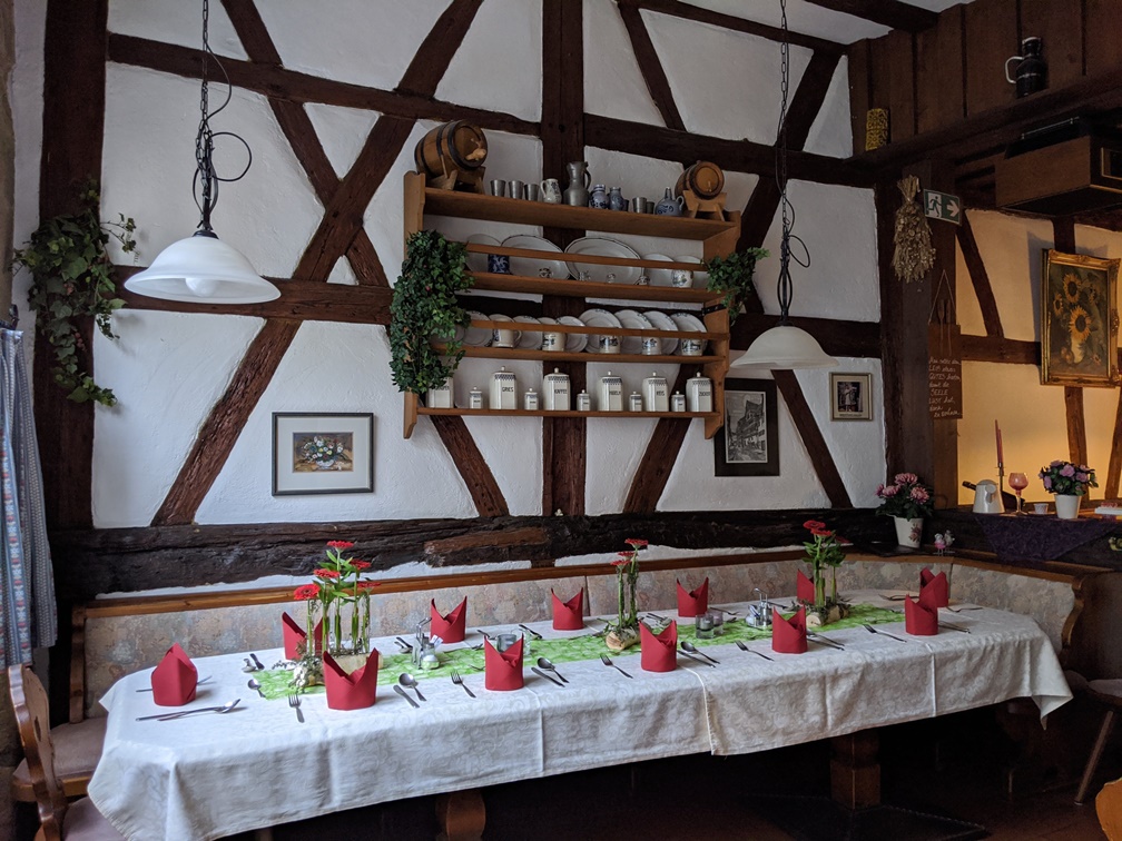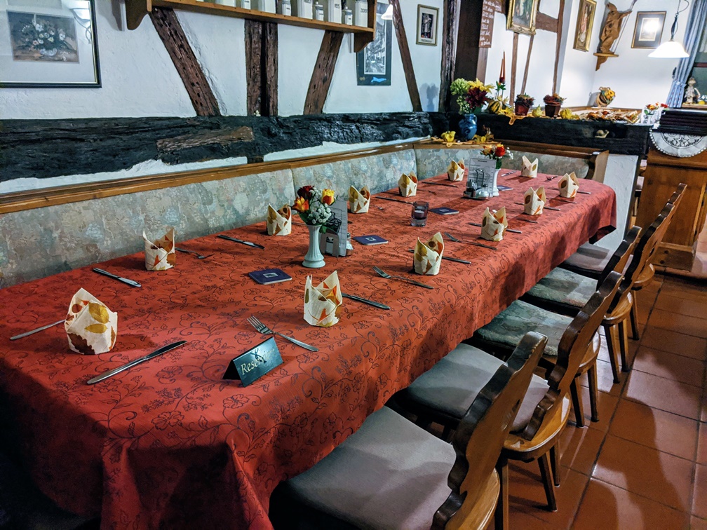 Wir bieten Ihnen eine deutsch-schwäbische, saisonale Küche mit verschiedenen Spezialitäten von Geflügel, Wild und Fisch - je nach Verfügbarkeit und Jahreszeit. Auch vegetarische Speisen servieren wir Ihnen gerne. Durch seine familiäre Atmosphäre und die hervorragende Lage im Schorndorfer Stadtzentrum, bietet unser uriges Restaurant den perfekten Raum für Ihre Feierlichkeiten. Seit vielen Jahren bewirten wir unsere Gäste bei Geburtstagen, Weihnachtsfeiern oder Konfirmationen und Firmungen. Unser Gebäude wurde 1683 vom Rotgerber Leonhard Seiz erbaut. Nach der Instandsetzung in den Jahren 1952 und 1962 wurde die Fassade im Jahr 2005 saniert. Die Stallung, Scheune sowie der Lagerraum wurden im Jahre 1985 zur Weinstube St. Urban umgebaut. Im Oktober 1986 konnten wir nach Umbau und Restauration im Untergeschoß unser Restaurant eröffnen. Seit dieser Zeit sind wir sehr bemüht, unseren Gästen den Besuch bei uns so angenehm wie möglich zu gestalten.